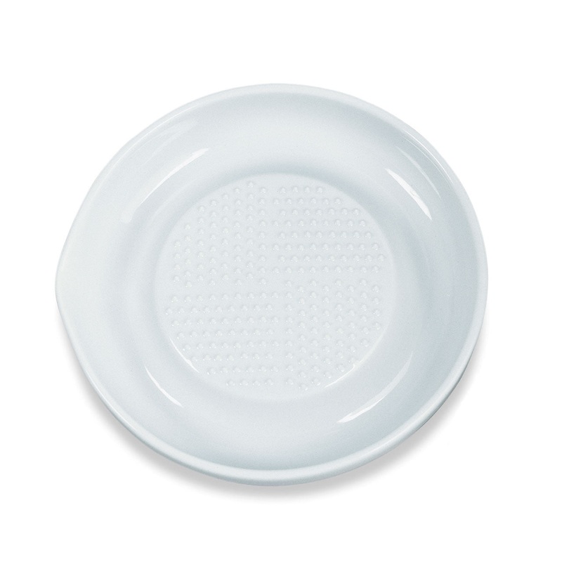 This unique shredding tool, made from an advanced ceramic close in hardness to diamond, will grate ingredients such as root vegetables. With rows of long-lasting sharp teeth, roots such as ginger are quickly shredded, leaving the unwanted fiber behind. Also great for elephant garlic, daikon radish, and parmesan cheese. The non-corrosive bowl collects the gratings and flavorful juices, without altering the taste. For ease of use, a silicone ring underneath holds the grater in place.