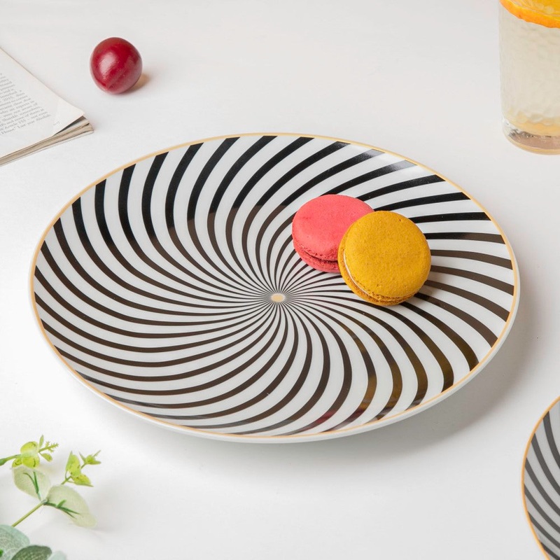 With this uniquely patterned dinner plate, liven up your dinnertimes. This plate, which has a white backdrop with a black whirlpool-like pattern, is made of tough, long-lasting ceramic. Create a lovely ambiance with the elegant ceramic dinner plates as you serve your favourite food and spend time with your loved ones.