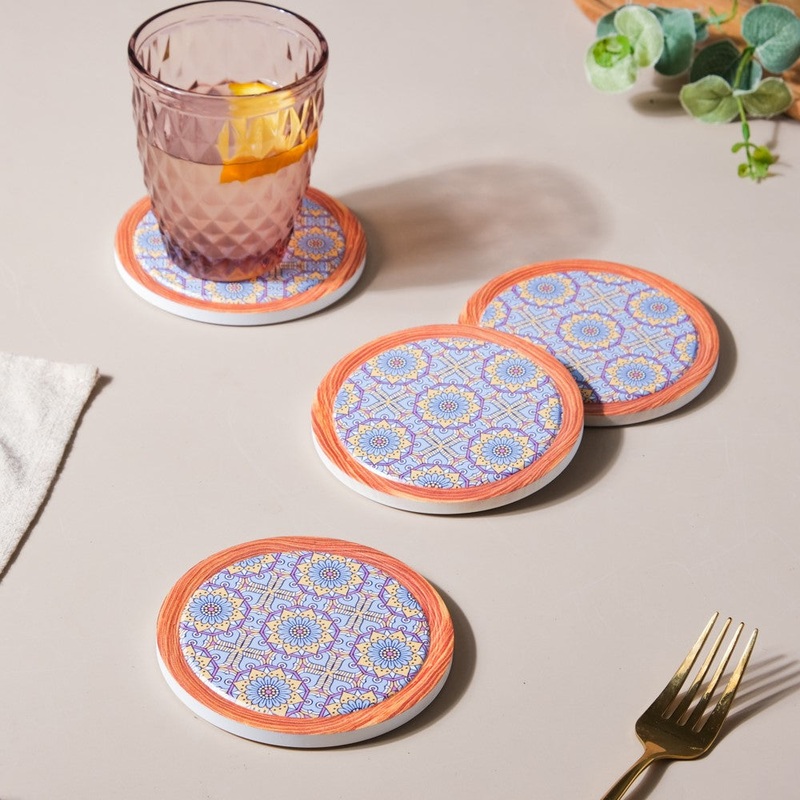 The circular ceramic coasters set of 4 are the ideal accents for beautifying the dining room table decor. Large coffee mugs, wine bottles, and oversized tumblers are all perfect fits on the intricately patterned coasters. Each coaster has a soft cork base that prevents it from scratching the tabletop.