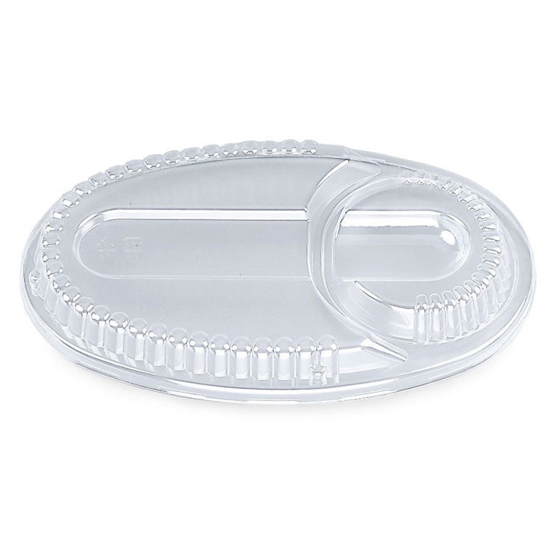 These are the lids for takeout trays for curry. This takeout tray for curry has 3 compartments for rice, curry sauce, and pickles.