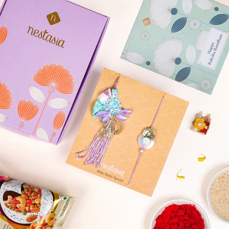 A soft play of lavender, pearl white, and aqua green, this Rakhi is styled on a mother-of-pearl disc with floral sequins and a single pearl drop. The lumba features a golden ring framed with shimmer threads, holographic lilac petals, and cascading lavender beads for a whimsical finish. The set includes 1 Rakhi band & 1 lumba, 1 roli chawal bottle set, 1 pack of mixed dry fruits (free gift), 1 gift box, and 1 wish card.