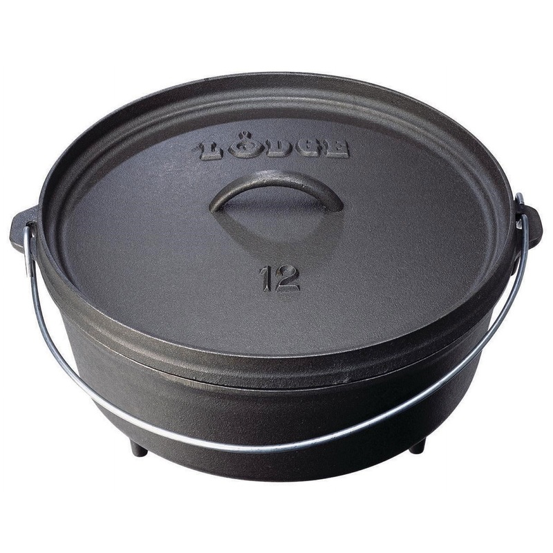 • Lodge 12 Inch / 6 Quart cast iron camp dutch oven with bail handle