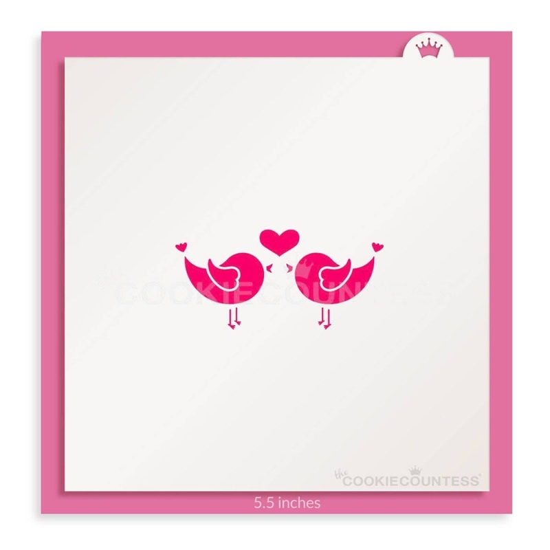 Love Birdsstencil. Popular for Valentine's Day and weddings.Design size is 2.75" x 1.32"Overall stencil size is approximately 5.5" x 5.5".PINK sections in image are the open sections.Stencils are 5mil Food Grade plastic, washable and reusable.