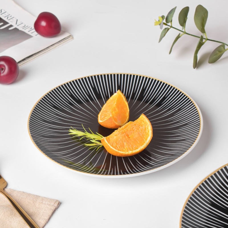 The ceramic snack plate features delicate linear patterns that make for a contemporary plate design. When placed on the table, the ceramic plate elevates the dinner ambience with its stunning design. The design of the ceramic plate ensures that every dish