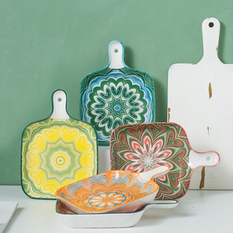 Mandala had always added artistic enchantment to the preaching of Buddhism, and its pure essence helped the artform survive the ravages of time. In designing the Mandala dish with a handle, the elements of the ancient art form have been put to use. The baking plate is embossed with a circular symphony of abstract shapes. The patterns on the plate evoke a feeling of calm and contentment on the dinner table or coffee table, wherever it is set up. The design of the dishes is balanced and harmonious. The use of colors on the mandala dish is profusely eye-catching giving the dish a quirky appeal. There is an endless number of recipes one could try to serve on the microwave and oven-safe plates. The depth of the dish makes it suitable for serving both dry snacks as well as curries.