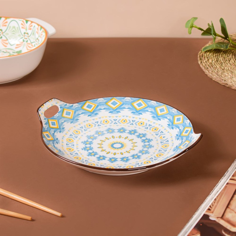The Mandala round dish, which is fashioned like a wok and has a handle, is ideal for serving gravy-based foods. It’s also simple to pick up, serve, and pass around the table thanks to the handles. A distinctive mandala design with diamond and floral motifs in blue and yellow tones is printed on the dish. The dish is available in four different mandala designs. The mandala dish with handle can be used as a salad plate, pasta plate, noodle plate, or platter.