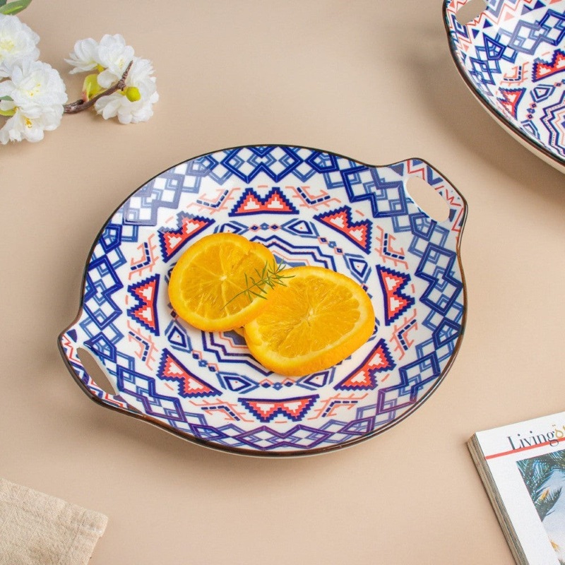 Mandala round dish that is shaped like a wok and comes with a handle and is perfect for serving dishes with gravy. The handles also make it easy to pick up, serve and pass around the table. The dish is printed with a unique mandala design that resembles temple motifs in shades of blue and red. The dish comes in four different mandala designs to choose from. The mandala dish with handle can be used as a salad plate, pasta plate, noodle plate, or platter.
