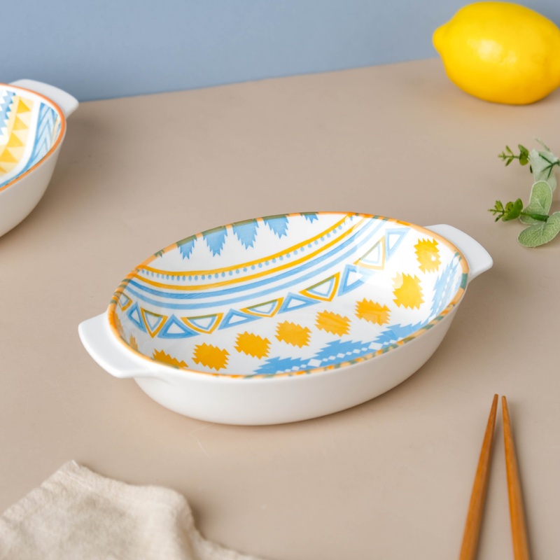 The blue and orange geometric design is printed in a way that will swiftly transfer one back to one of the many winters he or she has spent as a kid with his or her grandparents. A similar geometric pattern can be seen in the winter days when our grandmother used to weave sweaters for their little ones. The plates are designed to evoke a sense of nostalgia. Though our hectic lifestyles may not allow us to relive the golden days, the artistic and creative dish is offered with warmth and a touch of compassion. Because it’s oven safe, the ceramic plate with handles is great for serving mains like rice and noodles, as well as sizzling hot gravy items straight from the microwave.