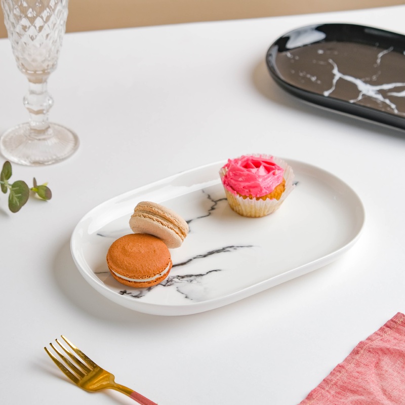The elegant marble patterned platter in a rectangular shape with rounded edges is an interesting and gorgeous take on one’s serve-ware collection. Displaying vibrance in its design and symmetry in its form, the platter is crafted to mix and match with crockeries of numerous colors. The platter is perfect to serve delicious macaroons, cupcakes, sauteed veggies, baked dishes, and snacks. Microwave-safe and dishwasher-friendly, the platter is available for purchase in variants of black and white. Handcrafted with care by skilled artisans, the gloss on the surface of the platter reflects the underlying charm and beauty. Use the ceramic platter to serve an array of delectable dishes of any cuisine to friends and family members. The contemporary marble pattern of the crockery makes them a worthy addition to any kitchen rack.