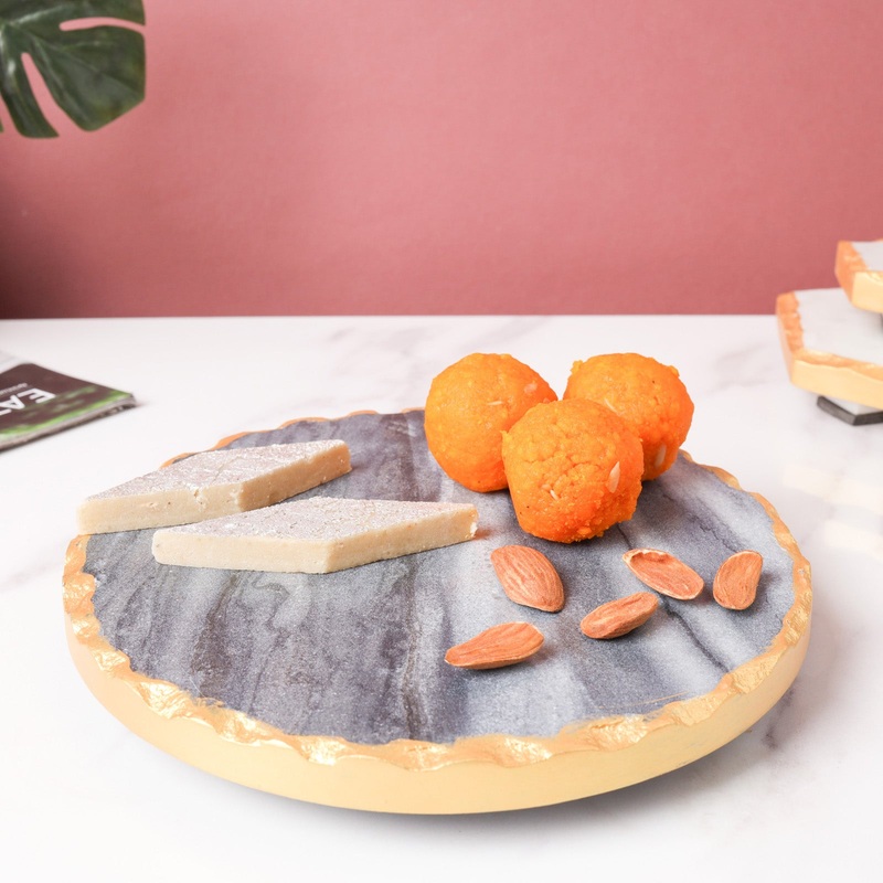 The grey marble serving platter with veined pattern looks classy and helps make a sophisticated presentation of sweets, cheese, bread, and crackers before guests. The beautiful platter is not microwave or dishwasher safe and should be cleaned with a dry cl