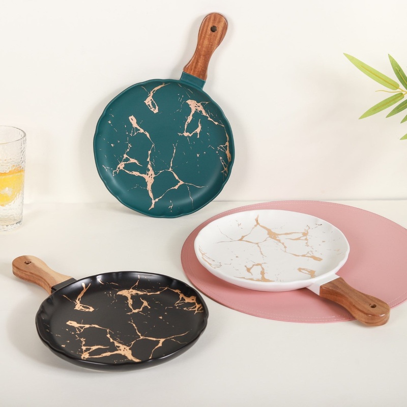 Marble round plates with a wooden handle are made in ceramic have a marble finish and come in 3 shading variations. The plates can be utilized as starter plates, nibble plates, platters, or fruit plates. The marble plate set looks smooth and exquisite that