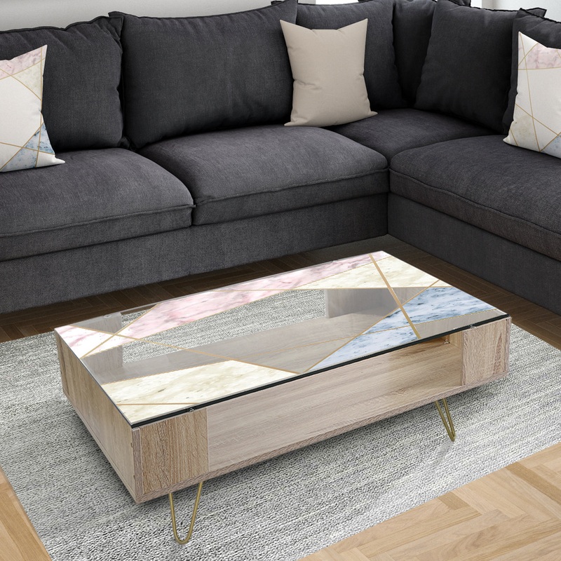 Set out bowls of buttery popcorn and bottled sodas in preparation for movie night on this Designart ‘Marbled Diamond 3’ coffee table. Featuring a glass tabletop for easy cleaning, this table boasts geometric patterns, making it right at home in mid-century modern spaces. The table has a spacious surface for storing remotes and books and metal legs for sturdy charm.