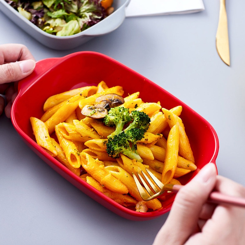 The microwave oven dish for baking and serving comes in red colour. Bake pasta, veggies, chicken, au gratin and desserts in the baking dish or use it as a salad bowl toss up fresh cold salad or serve snacks or noodles or fruits in the bowl. The bakeware can also be used to heat or reheat food in the microwave.