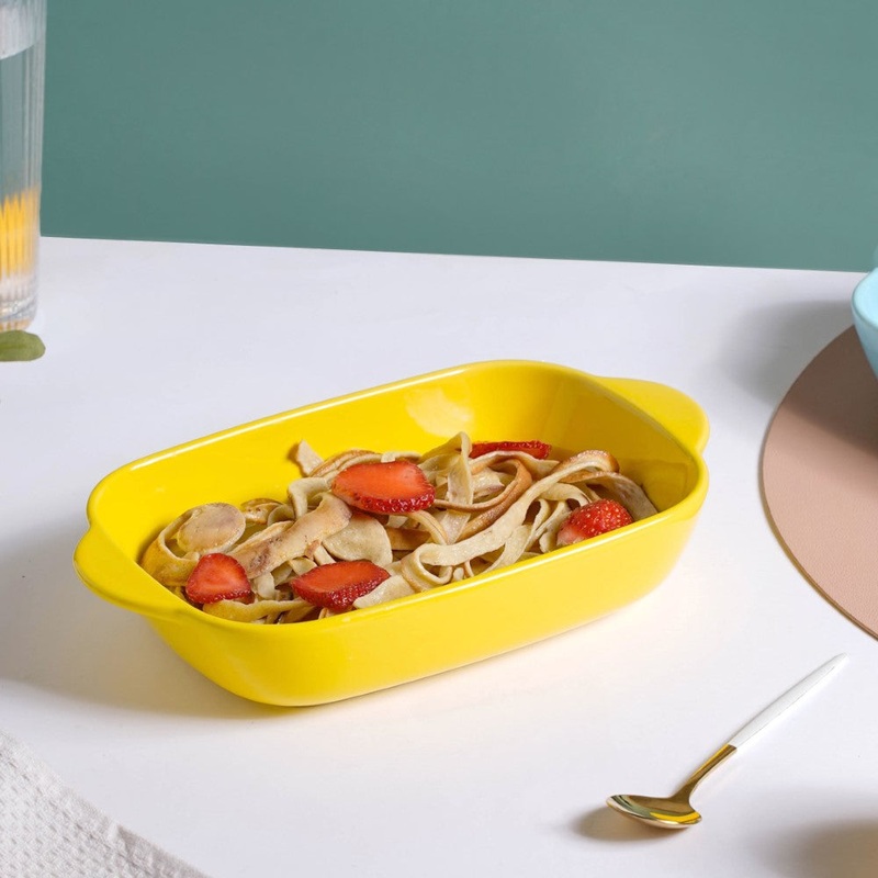 The rectangular ceramic baking dish is the ideal bakeware to bake cakes for your loved ones. The baking dish is crafted of sturdy ceramic and comes in yellow colour with a semi-matte finish. The bakeware features a handle on either side for easier functionality.