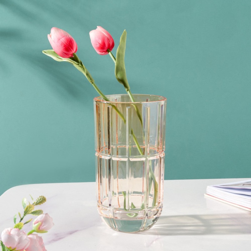 The clear glass vase features tones of amber that lend true grandeur to the decor setup. The mini vase features a linear textured surface and a cylindrical shape that is ideal for placing small floral stems. The subtle colour and sleek design of the glass vase will make the placed flowers as the main highlight of the setup.