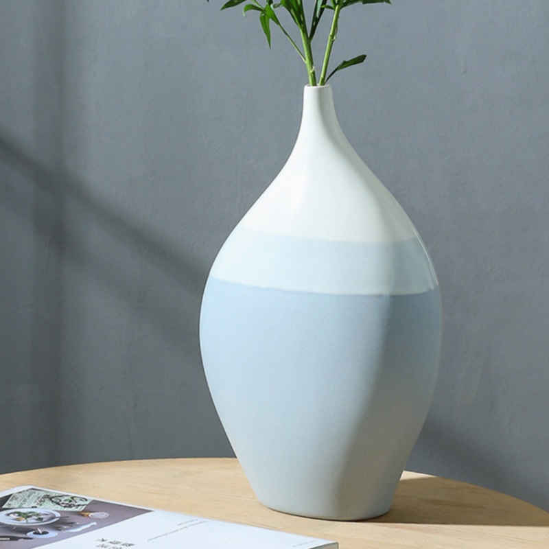Ceramic vase in pastel tones of blue has a broad base that narrows as it gets closer to the mouth. The flower pot can be used to add interest to a home or workplace design arrangement. The beautiful vase can be used on countertops, in restrooms, and in bedrooms.
