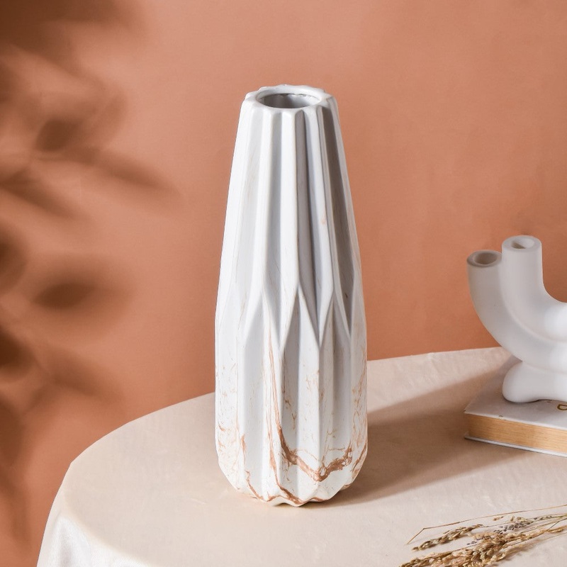 The vase with a warm brown-toned marble finish is crafted with sophistication to give your home its desired decoration. The flower vase will let you showcase your floral arrangement in a classy way in your home or office. The ceramic vase has a perfect blend of intricate texture and exquisite design that makes the vase blend easily with all interiors. The tall vase for living room decoration can also be used to decorate your bedroom, dining room, drawing room, and kitchen. Our marble print decorative vase makes an excellent gift on occasions like housewarmings, anniversaries, festivals, etc.