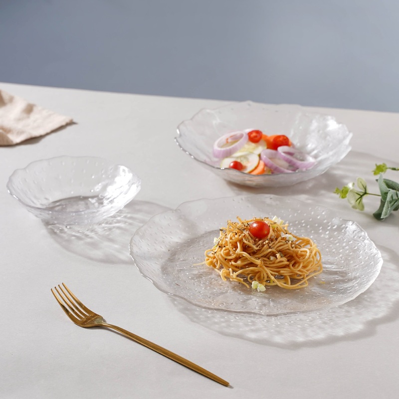 The 3-set glassware consists of 1 plate, 1 bowl, and 1 dessert plate. The transparent dishes have textured surfaces and irregular rims, giving them a modern appeal. The plate may be used for main meals during lunch or dinner, serve snacks or salads in the bowl, and, finish the feast off with some delicious ice cream on the small dessert plate.