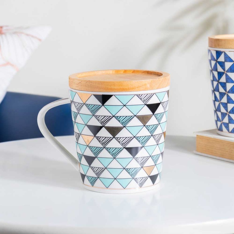 The multicoloured geometric pattern of the ceramic mug creates a playful mood on the breakfast table. Crafted in ceramic, the neutral hues of the quirky triangles add an eclectic appeal to any beverage. The durable ceramic mug comes with a wooden lid to prevent the beverage from losing its warmth and prevent any debris from falling into the beverage.