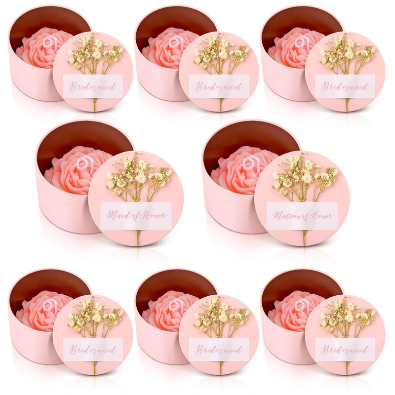 Features: Quality Ingredients: Made with quality soy wax and essential oils, our bridesmaid candles dispense a rich, long-lasting fragrance. These small scented candles are not only aesthetically pleg but also ensure a clean, even burn without black smoke, providing a healthier environment for you and your loved ones. Versatile and Appealing Design: This flower candle set flaunts a pink shade that adds a delightful pop of color to any decoration. Additionally, each candle comes with a beautifully designed sticker, ideal for a memorable gifting experience. This alluring design enhances the appeal, making these candles a nice choice for gifting. Specifications: Material: Bridesmaid candles: soy wax with essential oil Iron cans: iron Main Color: pink Size: Small scented candles: about 1.18 x 3.15 inches/ 3 x 8 cm Iron cans: about 2.4 x 3.15 inches/ 6.1 x 8 cm Package includes: 8 x Small scented candles 8 x Stickers 8 x White dried flowers 8 x Iron cans Notes: Manual measurement, please allow slight errors on size. The color may exist a slight difference due to different screen displays. Open flame may pose a risk of burns, please keep away from children.Wide Application: this wedding candle favor set can create a soothing atmosphere for any special occasion; Be it a bridal shower, an engagement party, a christening, a birthday, or a casual gathering, these bridesmaid proposal gifts will set the mood right, leaving a memorable impression on your guests. Proper Size: these miniature flower candles are made with care to ensure they’re easy to use; At 1.18 x 3.15 inches/ 3 x 8 cm, they make ideal decoration without occupying too much space; The conveniently sized can containers measuring 2.4 x 3.15 inches/ 6.1 x 8 cm, ensures you can carry around your favorite scents. Stylish and Reusable Cans: each of the fragrant soy wax candles comes in a separate iron can, also functioning as an elegant container; When your candles have run out, these cans can be cleaned and repurposed to hold jewelry or other small items; Our cans make these candles a gift that keeps on giving. Organic and Safe Aroma: our small scented candles are made from soy wax and organic essential oils; Unwind with the comforting aroma of our bridesmaid candles, while relaxing in the knowledge that they are safe, easy to clean and less likely to release harmful substances into the air. Comprehensive Gift Set: our bridesmaid candle gift set is the epitome of beauty and aroma as it brings together 8 small scented candles, stickers, white dried flowers, and elegant iron cans; It’s ideal for many occasions, such as bridesmaid proposals, engagements, and showers; Plus, the assembly of the products is part of the fun.