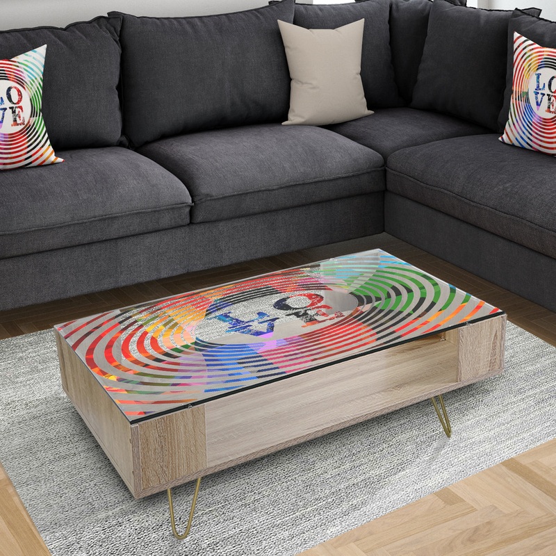 Choose a coffee table that doubles as a conversation starter when you bring home this striking wood, metal, and glass model. A multicolored pattern of concentric ovals surrounding the word ‘Love’ provides a retro vibe, and an open shelf offers a convenient spot for keeping books and other small items.