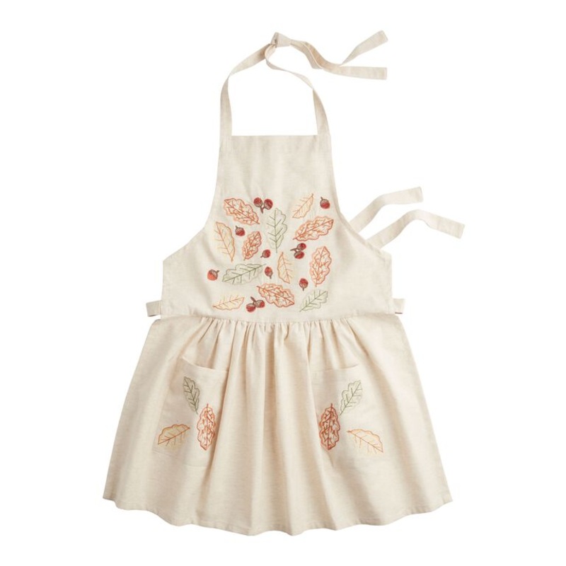 Protect your clothing from spills and splashes with our cotton and flax apron, featuring delicately embroidered leaves at the waistband and on the two pockets. The stylish dress shape, with adjustable ties at the neck and waist, ensures one size fits most.