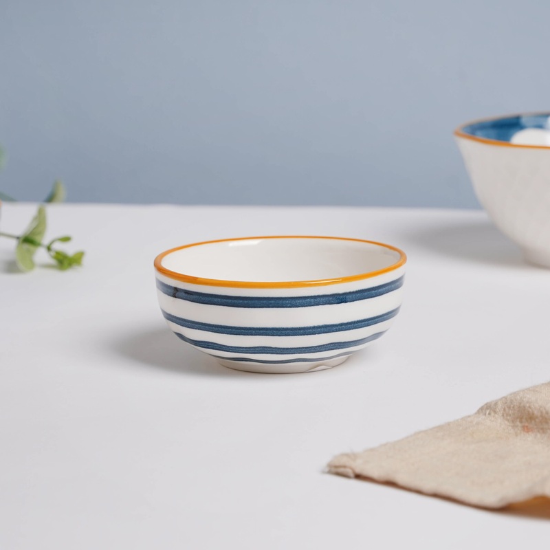 The Nitori dip bowl is the newest addition to the collection. The porcelain dip bowl in the typical Nitori pattern with horizontal stripes and a yellow rim is perfect dip bowl for chips, fruits, nuts and so on. The ceramic bowl can also be used as a personal dessert server if you wish to eat less. When combined with other Nitori bowls of similar size, the dip bowl can be used to create a unique present for everyone.