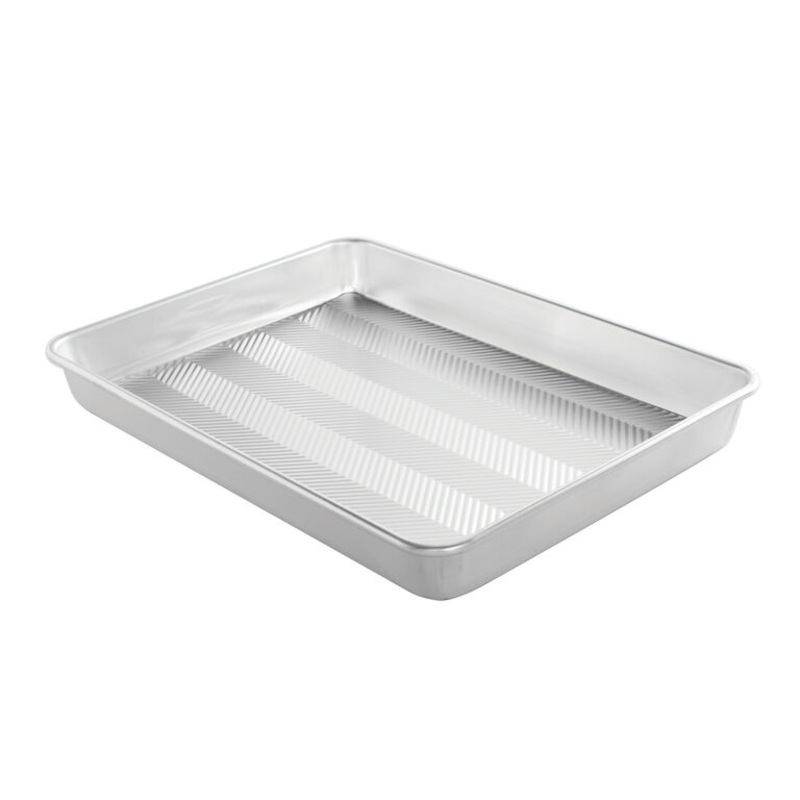 Crafted of fast-heating natural aluminum with high sides, this Nordic Ware baking pan features a rectangular base embossed with a raised prism pattern. This textured design encourages air flow for optimal browning and crisping. You can rely on this extra-large pan to bake huge sheet cakes or crisp potluck-sized casseroles with scrumptious results. Family-owned Nordic Ware is world famous for their traditional Scandinavian-style bakeware.