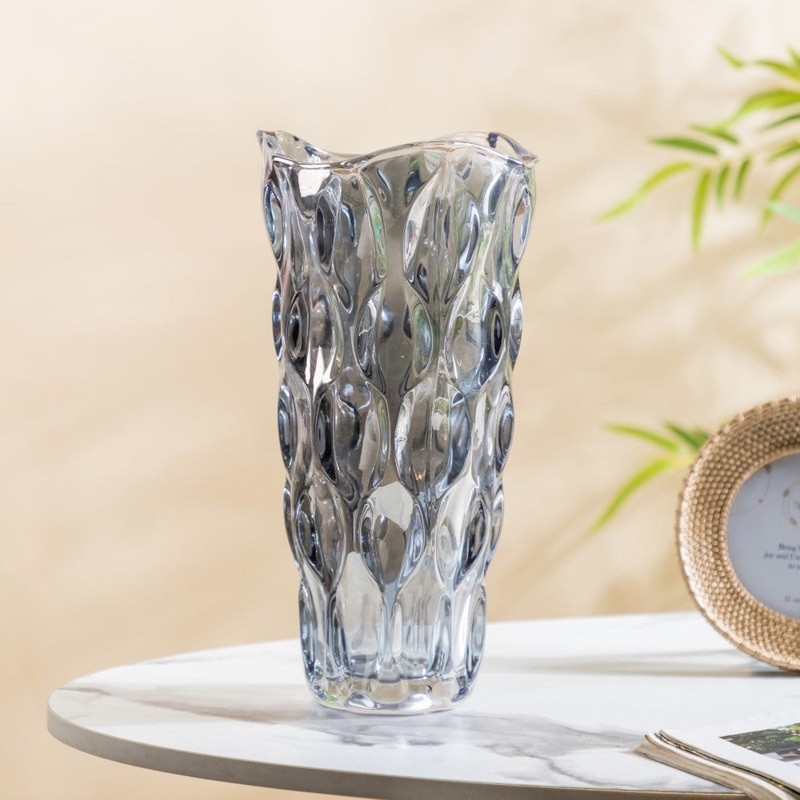 Crafted from high-quality glass and boasting a stunning, scallop-textured surface, the glass vase is a stylish addition to any home decor. The flower vase’s unique silhouette provides a surreal and captivating look that is sure to impress guests. The scalloped textures provide the vase’s surface with shapes of low-raised desert dunes, connecting the form of the vase to nature. Perfect for displaying a beautiful bouquet of your favourite blooms, the glass vase adds a contemporary element to any space. Whether placed on the centre table, side table, or dining room, the glass vase makes a chic style statement that is hard to ignore. Furthermore, it serves as an excellent gift option for your loved ones who appreciate elegant and sophisticated home decor pieces.