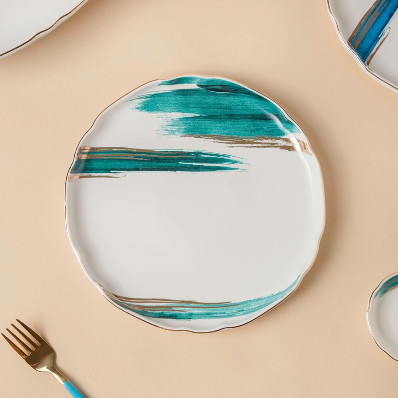 The ceramic coastal green dinner plate is both fancy and elegant and will look well in both modern and classic decor setups. With a dramatic creamy white layer on its surface, the ceramic dinner plate is ideal for serving bread delicacies like burgers, sandwiches, various flavors of cupcakes, and more as the primary dinner dish for the meals. The majestic dinner plate in the center adds to the appeal of the crockery and the other pieces that it is paired with for your layout. The glamorous cosmos dinner plate mixes alluring motifs with vibrant colors and is inspired to create a symbol of serene waves. The tableware is perfect for everyday usage as well as for those big dinner party occasions.