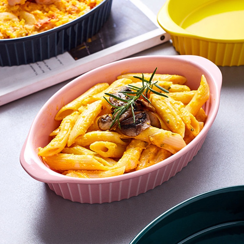 Microwave baking pan that comes in a pink colour looks stunning on the table. Use the ceramic dish to bake both sweet pie and savories like pasta and lasagna. Thebakeware is not only great for baking pie, tart, pasta or veggies, they can also be used for serving snacks and knick knacks.