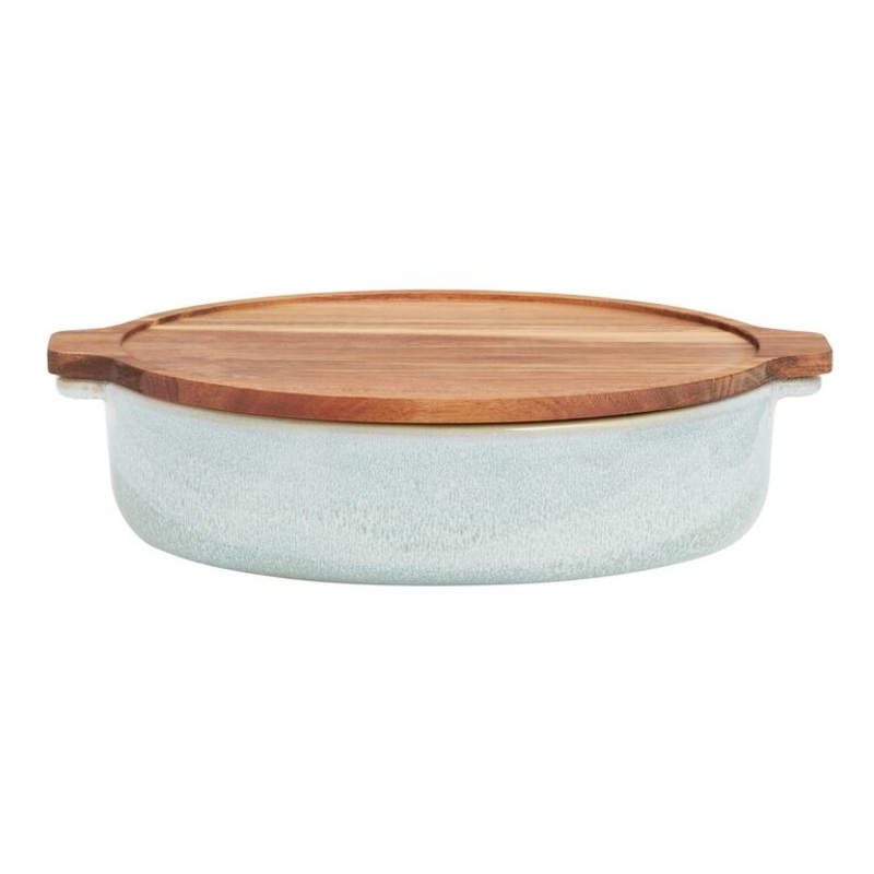 Crafted of stoneware with a reactive-glaze finish in a uniquely variegated sage green hue, our exclusive baker includes an oak wood lid that doubles as a serving trivet. With stoneware’s excellent heat retention and even distribution, this stylish oval pan is perfect for baking small casseroles and one-dish meals. Set the natural oak trivet on the table for oven-to-table serving and after dinner you can use it as a lid to store leftovers.