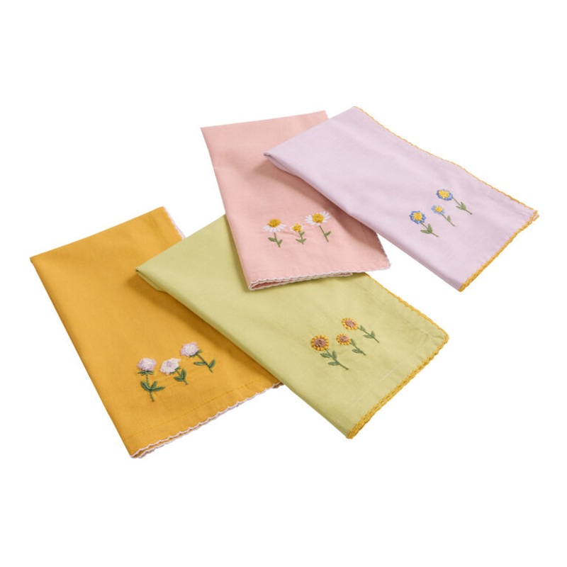Our set of 100% cotton napkins bring dainty nature-inspired details to your table. Made in India with a hand-done picoting edge, this pastel green, coral, marigold and lilac set is complete with tiny embroidered and loop-stitched florals. These precious table linens brighten your everyday place settings and are a pure delight at dinner parties.