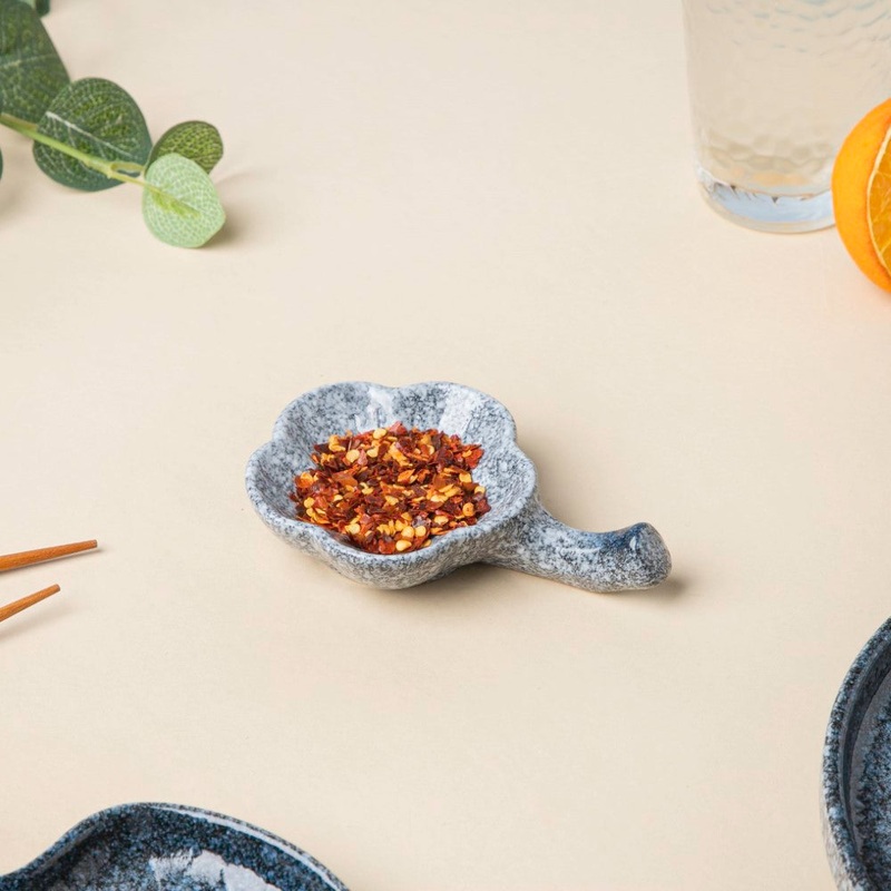 With the exquisitely sculpted dip bowl, snack time can be transformed into a feast to be treasured and savoured. The stoneware-inspired floral-shaped ceramic dip bowl features a speckled blue and grey pattern that looks extremely contemporary. The extended handle on the dip bowl is ideal for placing chopsticks on it. Put zesty salsa or creamy mayonnaise dips in the bowl and serve them with your preferred snacks.