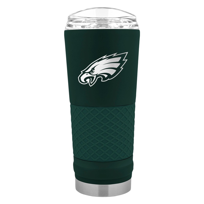 This 24 oz. DRAFT tumbler is made of high quality powder coated stainless steel. Features high definition laser etched team graphics. Available in team color with matching silicone grip.