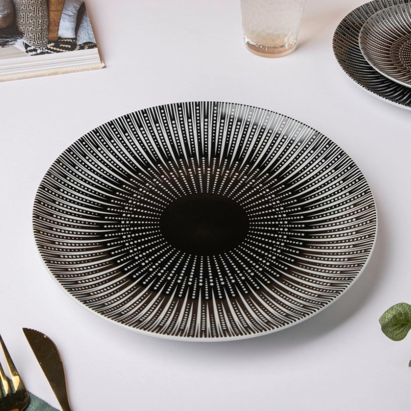 A spectacularly patterned dinner plate graces the table with a modern element. The monochromatic hues and patterns of black and white make the plate look like an artistic masterpiece. Featuring a glazed sheen, the plate has been constructed of sturdy ceramic and elevates the dining experience with its addition.