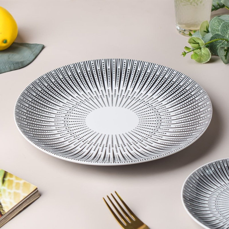 The well-illustrated ceramic dinner plate is a modern way to present deliciously cooked food in style. The abstract geometric patterns are minimalistic as well as attractive. With a smooth glaze and sturdy build, the ceramic plate makes for a dish that is chip and crack resistant.