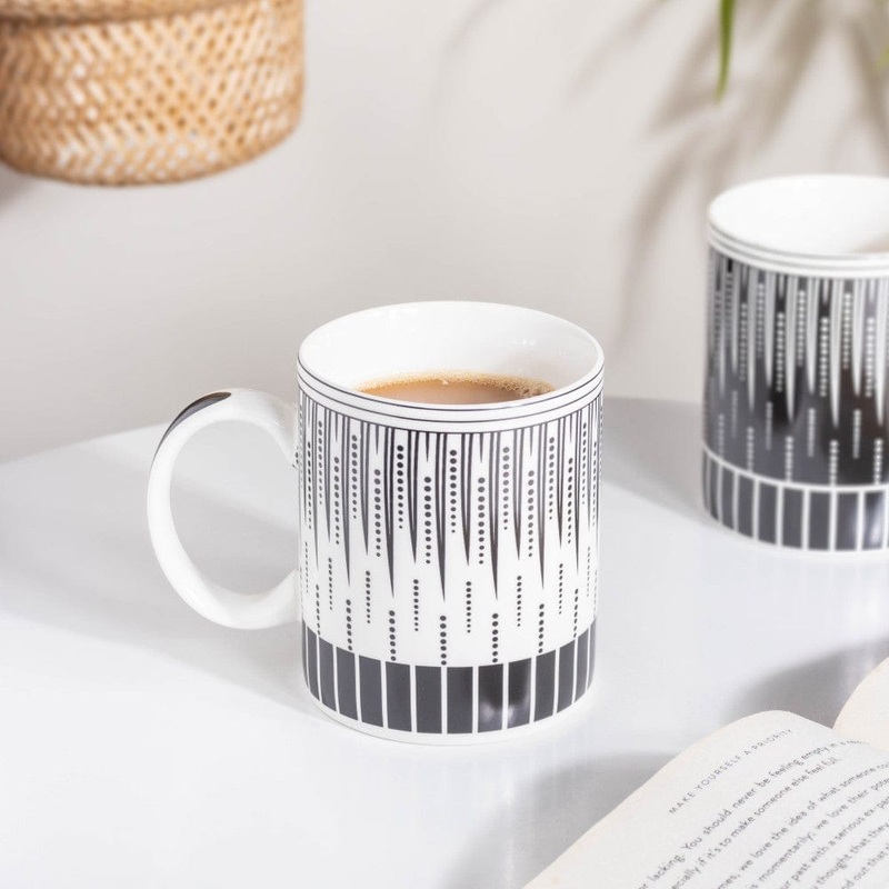 The white mug with linear and geometric patterns all over lends an eclectic finish to the modern tablescape. Serve regular morning drinks such as coffee or tea or any other beverage in the cup. The white and black patterned mug with the ceramic mug’s smooth finish lends a unique elegance to the evening tea setup.
