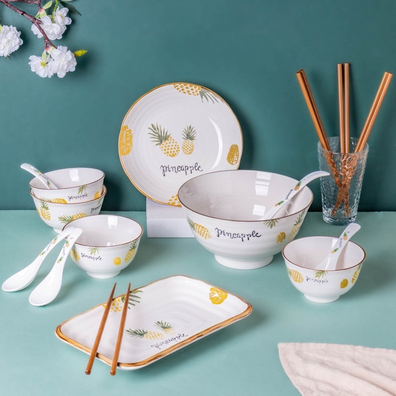 The white crockery set with pineapple motifs all over looks spectacular on a modern and contemporary tablescape. The quirky pineapple print on the crockery set makes it a perfect fit for the urban-chic home. Pair the serving spoons with the soup bowls to serve vegetable stew, chicken cream soup, or any lentils. The wooden chopsticks can be used for ramen, noodles, sushi or momos. Complement the snack set with white or yellow ceramic dinner set to complete the look of the tablescape.