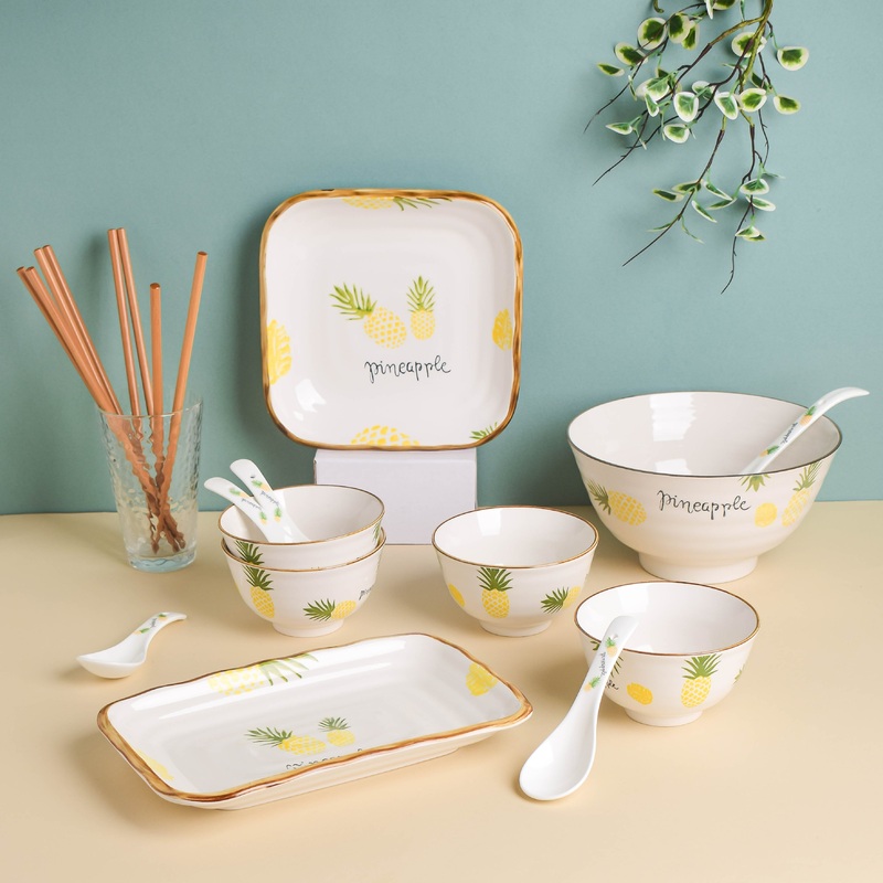 The ceramic soup and snack set with pineapple motifs, inspired by a tropical theme, is perfect for serving piping hot soup and oatmeal. While the serving bowl can hold the soup, the small bowls can be used for individual serving and the square or rectangle plates can be used for serving croutons or other munchies. One can also slurp on delectable noodle soup or a delicacy like the Burmese Khao Suey. The set comes with one serving bowl, one rectangle plate, one square plate, one serving spoon, four soup bowls, four soup spoons, and four pairs of chopsticks.