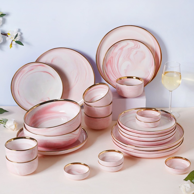 Turn the tableware into something fun yet classy with the new marble tableware collection for 6. The pink swirls and golden rim featuring on the plates and bowls from the collection will make for a glam tableware, adding to the aesthetic value of the setup. Charm your guests as the light shade will make the meal pop, no matter which cuisine it is that one chooses to serve. Use the pretty pink dinnerware to create a tablescape for a dinner party on the occasion of birthdays, anniversaries, or even weddings by pairing it with white flowers and gold cutlery from our collection. The opulent set is also appropriate for brunches and breakfasts because of the pastel color and marble design. The marble plates from the collection have a slight depth that makes them ideal for serving pasta, noodle, and snacks, as well as rice, sandwiches, and desserts.