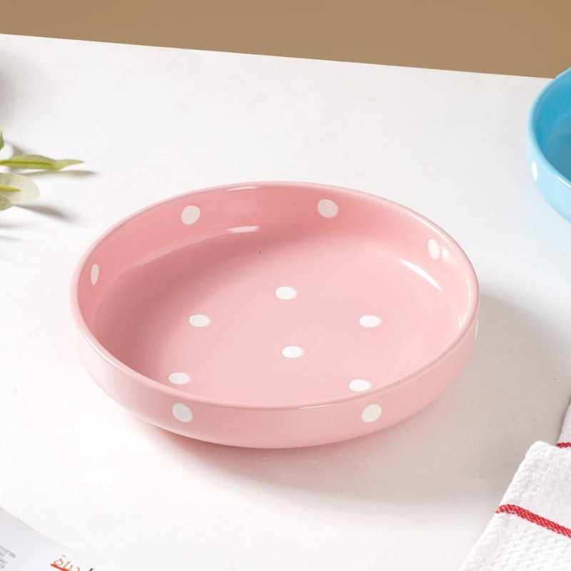 The quirky plate in red, blue, green, and pink, would look stylish as breakfast dishes as well as pasta and spaghetti plates. Use the dishes to serve an omelet with toast in the morning, salads with lunch, or snacks in the evening. The polka dot pattern is an evergreen one and will never go out of style. The non-porous nature of the ceramic plate makes them suitable for everyday use, washing, and cleaning remaining the same as that for all other utensils.