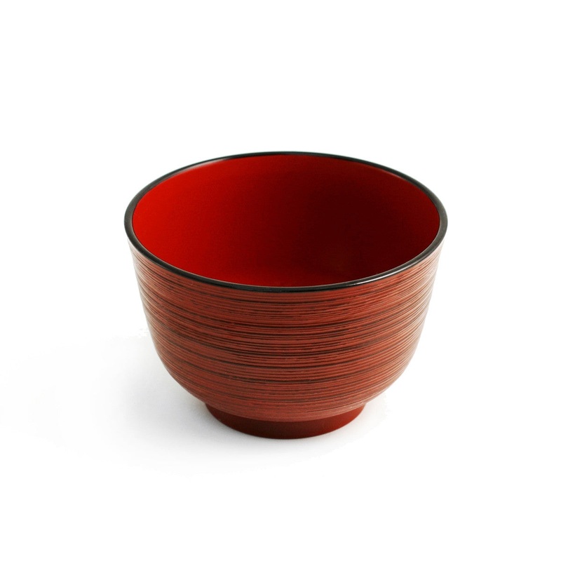 This red resin owan bowl has a wood-like appearance and is typically used for serving miso soup but can be used for other soups and stews as well.