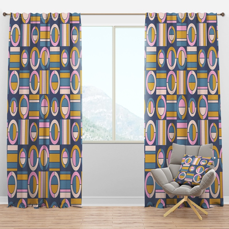 Flaunt your love of retro style with this patterned curtain panel from Designart. Featuring a bold, mid-century modern print in pink and gold on blue, this curtain makes a gorgeous addition to vintage furnishings. The use of fade-resistant, high-density Italian inks keeps this curtain bright over time, and the faux-linen fabric offers noise- and draft-reducing properties.