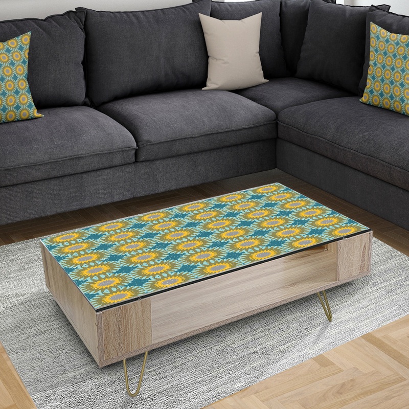 Invigorate the decor in your living room with this ‘Retro Circular Pattern I’ coffee table by Designart. With bursts of sunflower yellow on a bluish-green background, this coffee table blends seamlessly with most color schemes. The glass table top protects the print from staining while the lower shelf provides space to store books and remote controls.