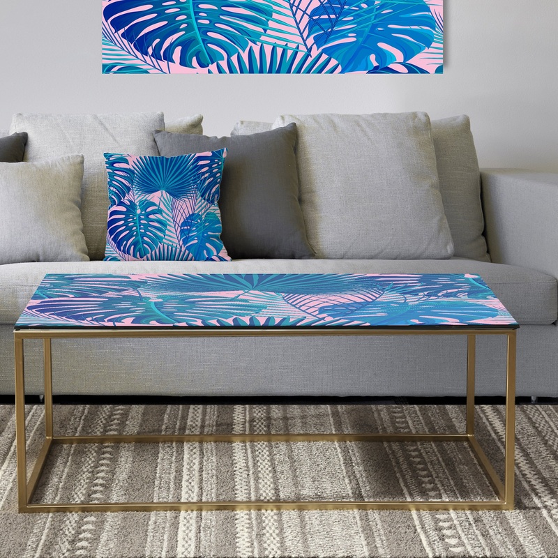 Keep remotes and magazines at hand for guests with this Designart ‘Retro Floral Pattern X’ coffee table. Showcasing tropical patterns in a vibrant blue color for a welcoming vibe, this coffee table is printed using high-density Italian ink for durable vibrancy. Featuring a glass top for easy cleaning, this table has a sled-style metal base for stability.