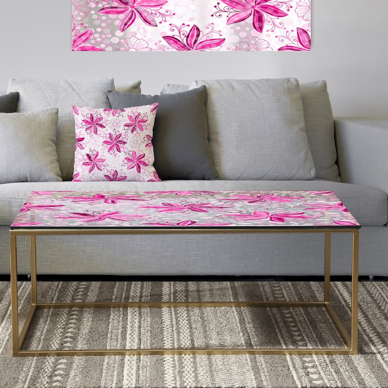 Coordinate the glamorous flair of your modern den with this table’s charming floral-style print. The sturdy metal frame showcases the simple elegance of a sled-style design and a goldtone finish, pairing its strong, enduring construction with a contemporary-style appeal. Thanks to the high-density Italian inks, the print remains vibrant and captivating under the glass top.