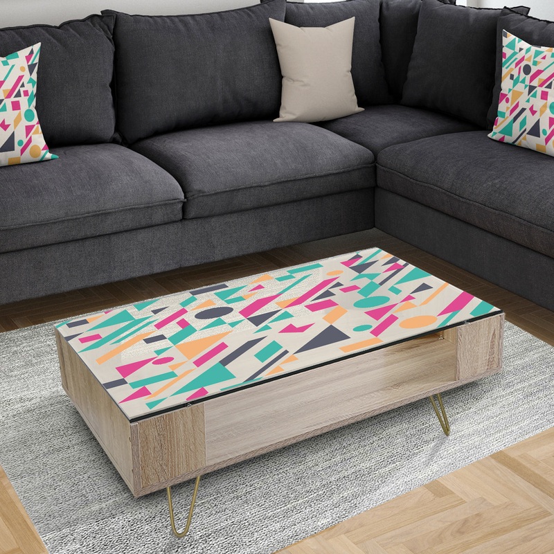 Color and geometry combine for an eye-catching addition to a room with this Retro Geometric Design III coffee table from Designart. Multiple colors and shapes on a cream background attract attention and work with many modern and contemporary decors. The design is painted onto the underside to protect it from top damage.