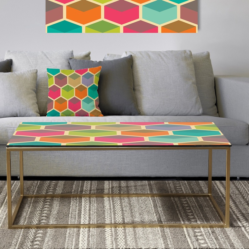 Showcase your love of color with the ‘Retro Hexagon Pattern I’ glam coffee table. Displaying a mid-century pattern that offers the illusion of 3-D cubes, this piece provides the perfect fun centerpiece for vintage living areas. A sturdy metal frame-style base enhances the stability of this table, while printing beneath the glass extends the life of the art.