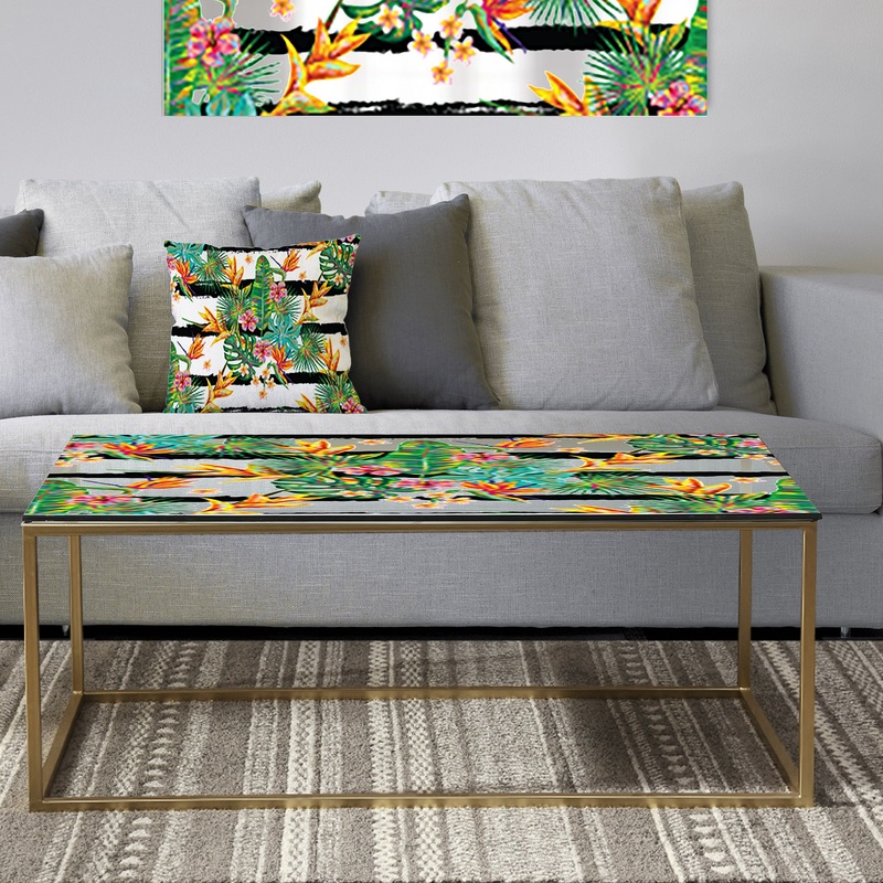 Inject a tropical vibe into your decor with this Designart coffee table featuring a bold and colorful tropical foliage design applied to the underside of the glass table top using high-density Italian inks for long-term beauty. The goldtone metal base provides a minimalist look with sturdy support.